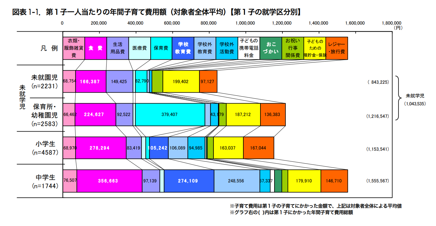 加えて、教育費以外の養育費(食費・衣類・医療費など)は年間約103万円がかかるため、子育て全体では年間約157万円(公立の場合)の支出が見込まれます。