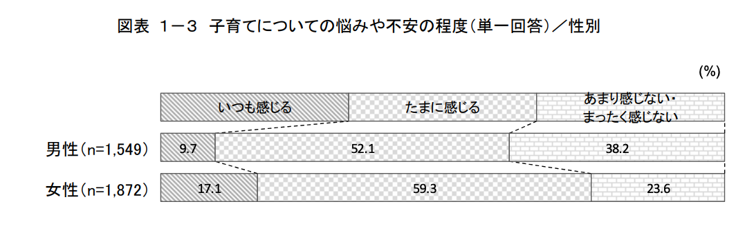 子育てについての悩みや不安を「いつも感じる」「たまに感じる」と回答した割合は、女性(母親)が76.4%(いつも17.1%+たまに59.3%)に上るのに対し、男性(父親)は61.8%(いつも9.7%+たまに52.1%)でした。この結果から、母親は父親よりも高い頻度で、かつより深刻に悩みを感じている状況が客観的にわかります。